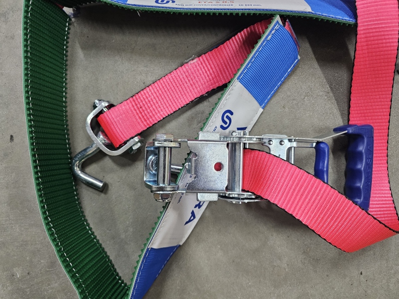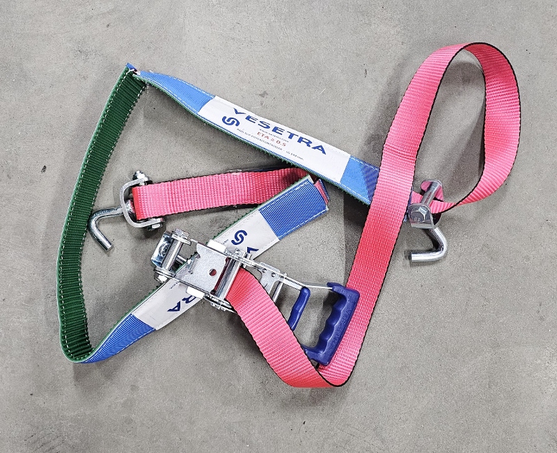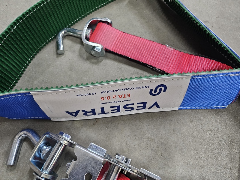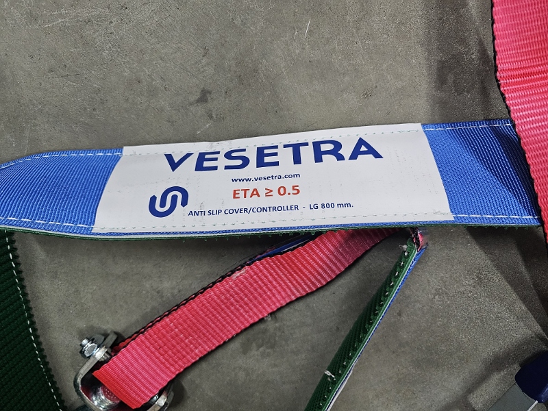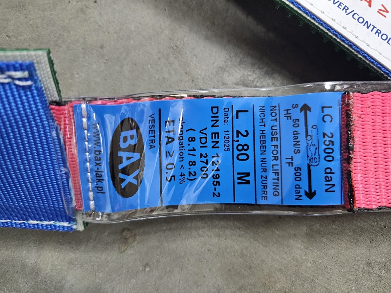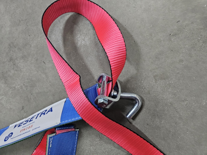 PAS FIRMY VESETRA, SZEROKOŚĆ PASA 50mm, ROZCIĄGLIWOŚĆ 4%, 3 HAKI OBROTOWE, OPASKA GUMOWO MATERIAŁOWA NA OPONĘ DŁUGOŚCI 1 x 800mm + 1 x 400mm - 80mm SZEROKA DŁUGOŚĆ - L 2,80 mt. - 50 mm. - HAK 450 HAK 470 + RACZA 511 P/C EN 12195-2 VDI 2700 8.1 / 8.2 S HF 50daN/S TF 500daN BRZEGI PASA OBSZYTE DODATKOWĄ NICIĄ ZAPOBIEGAJĄCĄ STRZĘPIENIU SIĘ PASA LC = 2500 daN SHF = 50 daN STF = 500 daN