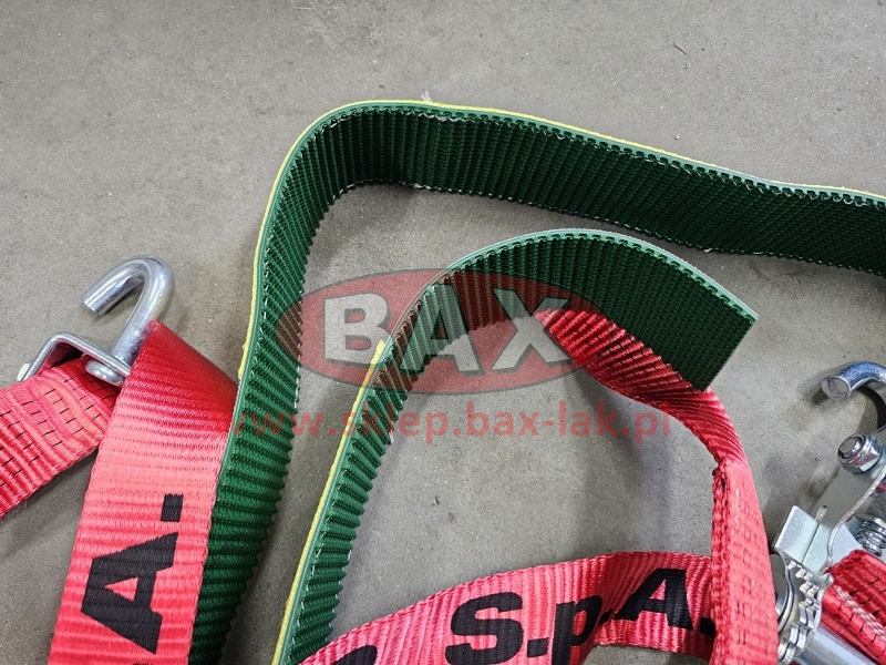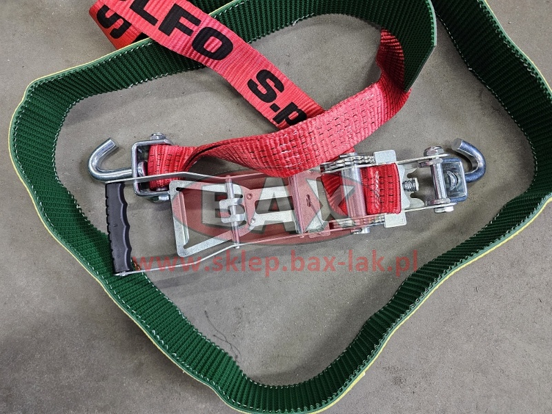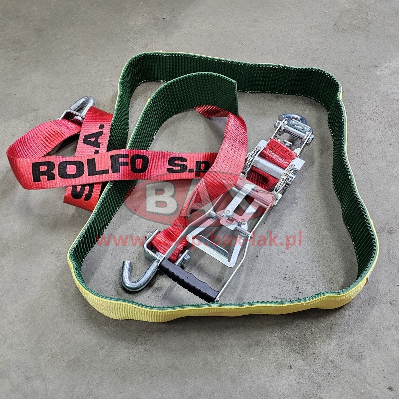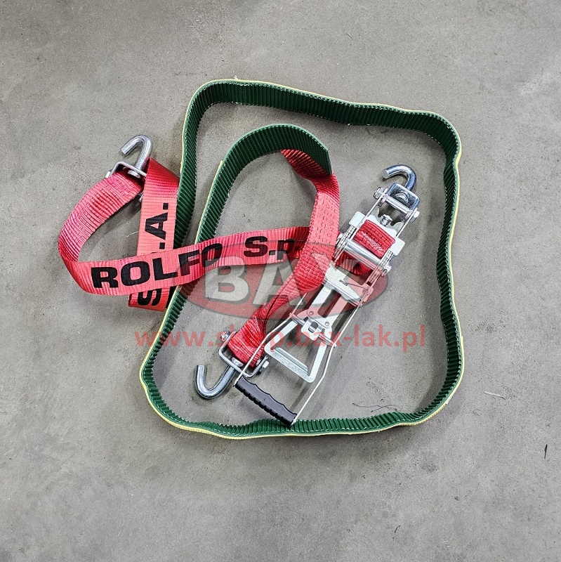 PAS FIRMY ROLFO, całkowita długość 3,7MB, SZEROKOŚĆ PASA 50mm, ROZCIĄGLIWOŚĆ 4%, 3 HAKI OBROTOWE, OPASKA GUMOWO MATERIAŁOWA NA OPONĘ DŁUGOŚCI 2150mm KOŃCE O DŁUGOŚCI 20cm NIEZASZYTE Z OBU STRON. DŁUGOŚĆ - L 3,70 mt. - 50 mm. - HAK 450 HAK 470 + RACZA 511 P/C 0,3MB EN 12195-2 VDI 2700 (8.1 i 8.2) S HF 50daN/S STF 500daN NADRUK ETA >= 0,5 NA ETYKIECIE RĘKAWA LC2500 daN